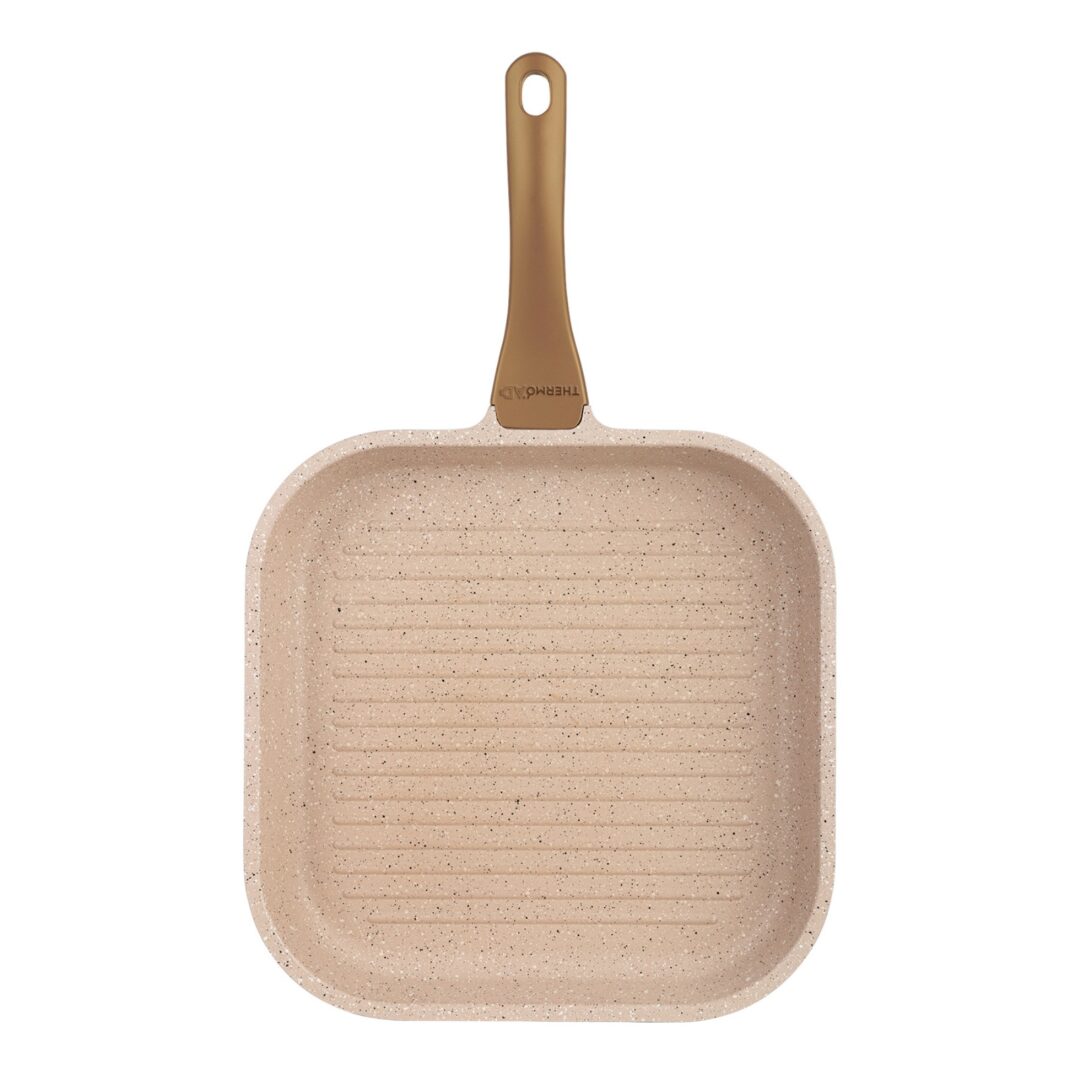 ThermoAD Granit Kaplamalı Izgara Tavası, ısıyı uzun süre muhafaza eden kalın tabanı sayesinde kusursuz pişirme performansı sunar..